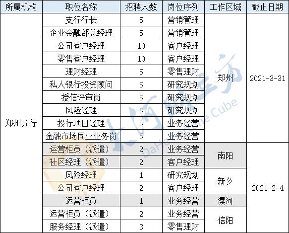 工作区域包括郑州、南阳、新乡、漯河、信阳等地。郑州地区报名截止日期为2021年3月31日,其它地区报名截止日期为2021年2月4日。