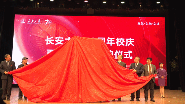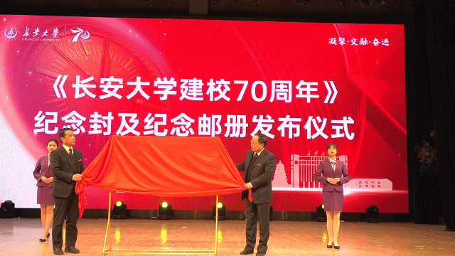党委副书记、纪委书记孟德勇,党委副书记徐引正揭晓纪念封及邮册为纪念长安大学建校70周年,西安长大资产经营有限公司联合中国邮政发行了《长安大学建校70周年》纪念封和纪念邮册。