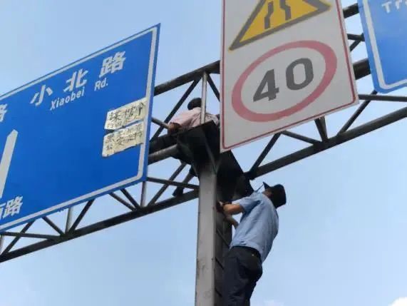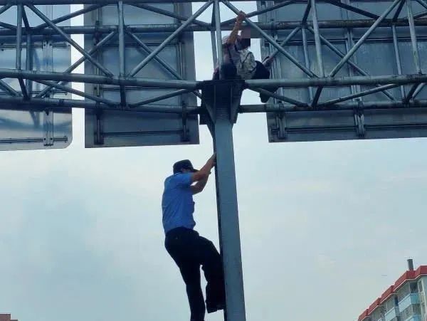 一名男子爬上10多米高的路牌架