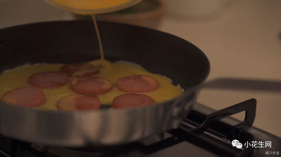 粉色火腿切片,放在油锅里煎一会儿再把鸡蛋液均匀地倒进去