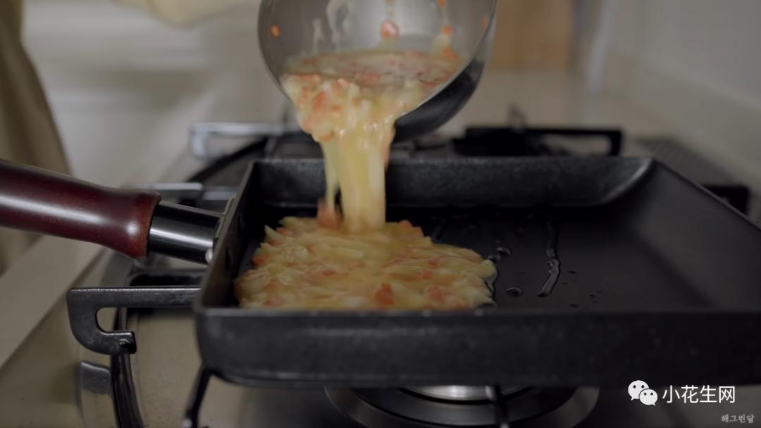 一勺一勺地捞进煎锅烙成圆圆的鸡蛋饼
