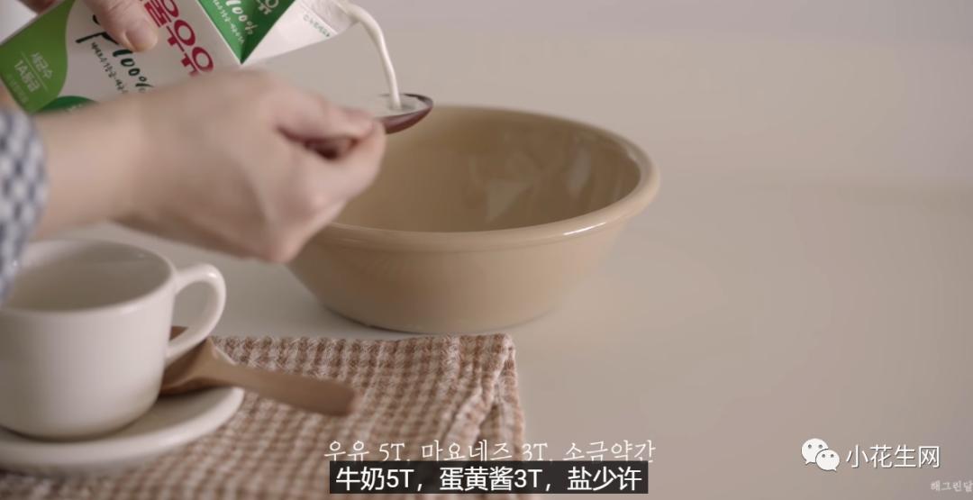 倒进牛奶5勺,蛋黄酱3勺,盐少许