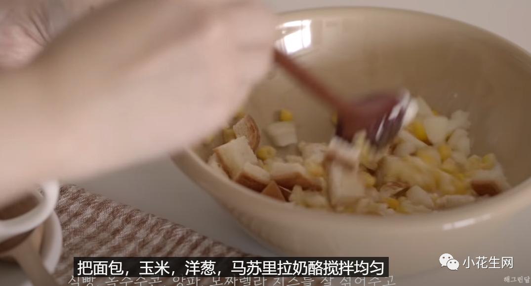 再放玉米粒,洋葱,马苏里拉奶酪充分搅拌后