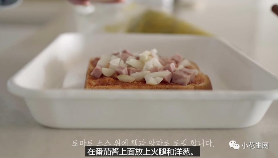吐司刷上番茄酱,放好火腿粒和洋葱