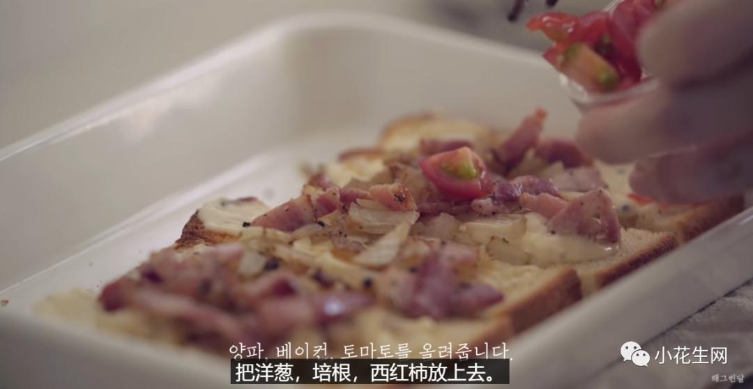 面包烤得微熟放上洋葱、培根、西红柿、菠菜