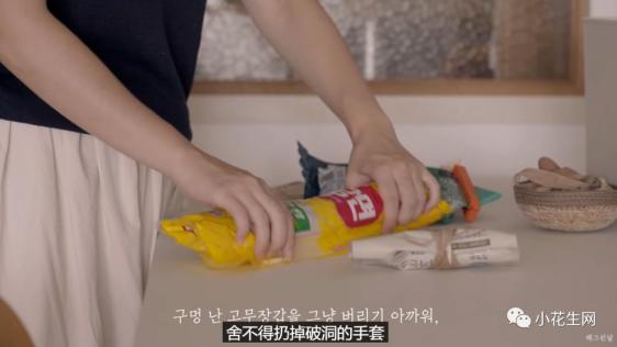 也很注重废物利用,舍不得扔的手套剪成一条一条的,当作皮筋用。