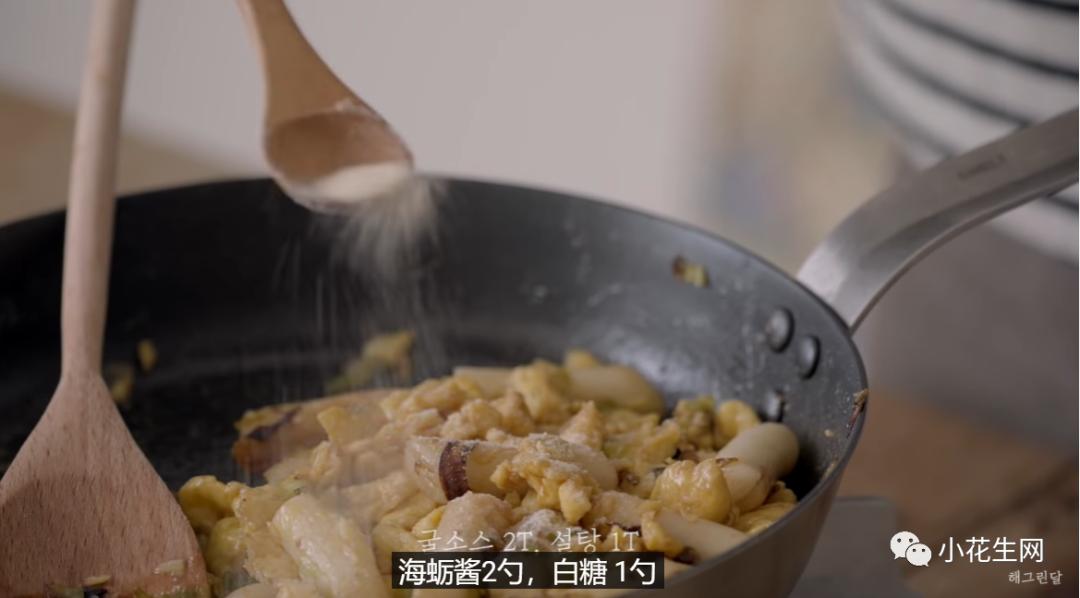 做出葱油后,倒入蛋黄饭,加上海蛎酱