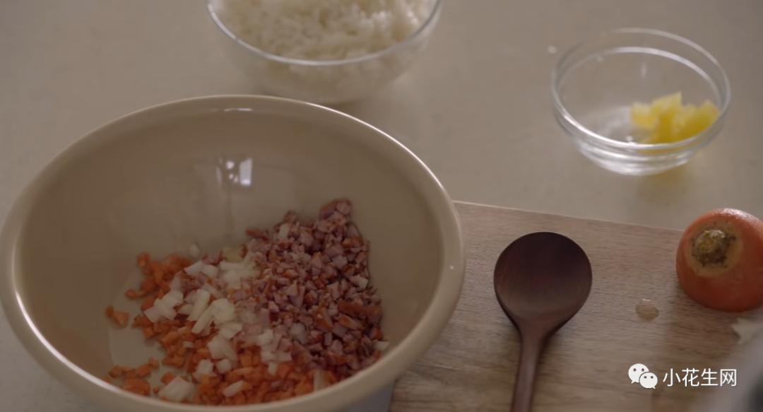 什么胡萝卜、洋葱、火腿肉…都切成小块