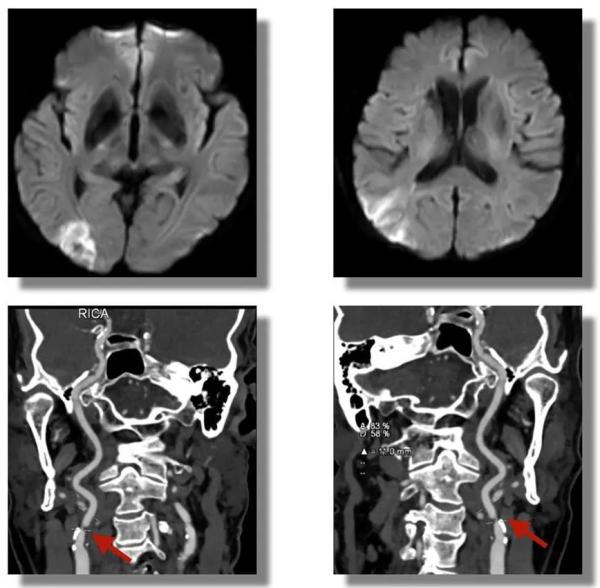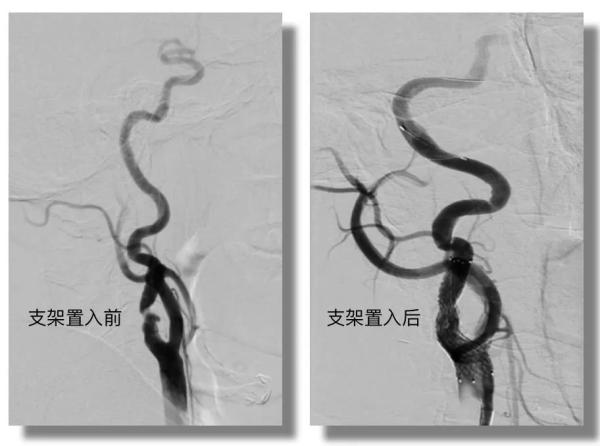 通过我院卒中绿色通道,该患者从到达急诊到应用溶栓药物(DNT)时间窗为28分钟。对于脑卒中患者来说,时间就是生命,“快”是救治的关键。随后,颅脑核磁共振证实,患者此次发生的是右侧大脑半球新发梗死灶,进一步的血管检查发现,患者右侧颈内动脉起始段重度狭窄。经过全脑血管造影术,进一步明确诊断,立即给予支架置入成形术。