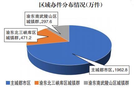区域办件分布情况。2020年1月1日至2020年12月31日,区县办理2731.6万件。其中,主城都市区1962.8万件,渝东北三峡库区城镇群471.2万件,渝东南武陵山区城镇群297.6万件。主城都市区由于人口密度大,创业激情高,政务服务需求量高,办件量较大。