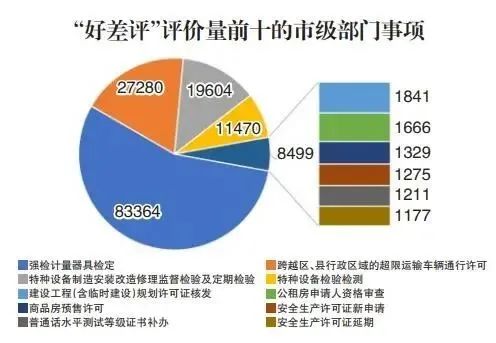 市级部门事项中,强检计量器具检定,跨越区、县行政区域的超限运输车辆通行许可,特种设备制造安装改造修理监督检验及定期检验,特种设备检验检测,建设工程(含临时建设)规划许可证核发,公租房申请人资格审查,商品房预售许可,安全生产许可证新申请,普通话水平测试等级证书补办,安全生产许可证延期等10个事项评价数量最多,平均评价数量超过27.3万条。