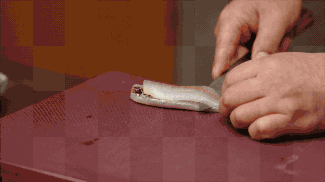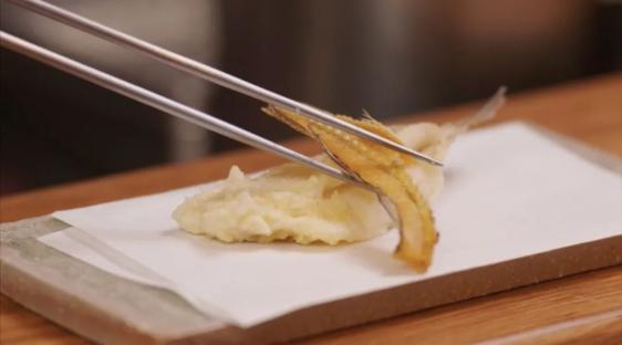 甘鲷不需要去鱼鳞,因为鱼鳞很好吃,只需鱼身包裹面衣,鱼鳞不需包裹面衣,这样炸出来的天妇罗鱼皮非常酥脆,肉软嫩。