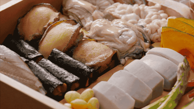 今天我们用到喜鱼、海苔包海胆、金时芋、对虾、甘鲷、下仁田葱、芦笋、簪子(小胡萝卜)。