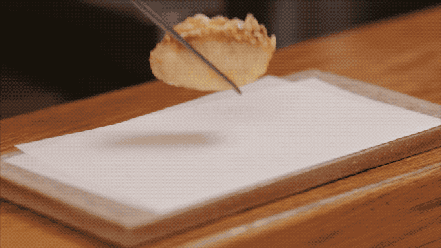炸制天妇罗用的是太白胡麻油,是用天然胡麻直接压榨而成的油,保留了芝麻油特有的香气,但又不会特别浓郁,盖过食材的原味。炸制的油温一般控制在160-190度之间,喜鱼对油温的掌控要求很高,需要多加练习才能做好。