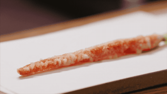 簪子是京都产的一种小的胡萝卜,也是很难入手的一种食材,入口清甜。炸的时候要注意火候,保留蔬菜原有的脆脆的口感至关重要。