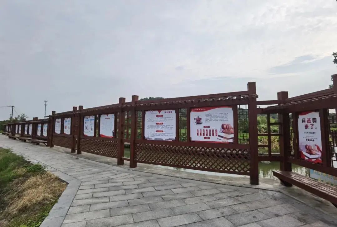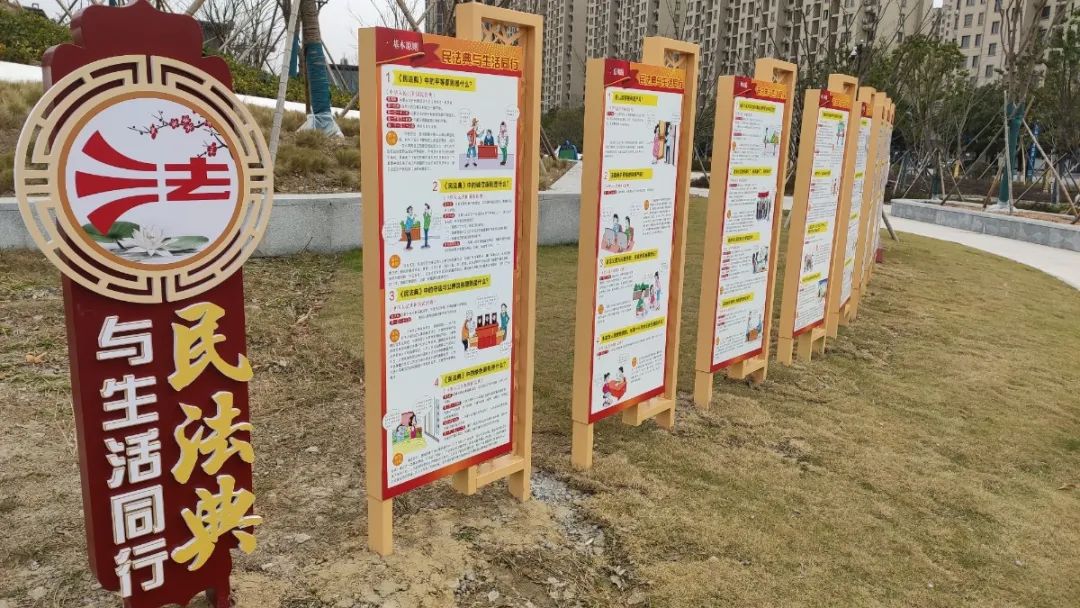 为更好地营造崇尚法典精神、共筑美好生活的法治文化氛围,让民法典走到群众身边、走进群众心里,2020年11月,江口街道精心打造的首个民法典公园正式建成。该公园坐落于江口街道后胡村内,占地3亩,集普法教育、休闲健身于一体。公园通过宣传展板、法治长廊、法治对联、法治标语、法治案例等多种形式,将民法典的重大意义、鲜明特色、核心要义等以图文并茂的形式展示出来,全方位展现了民法典“社会生活百科全书”的特征。