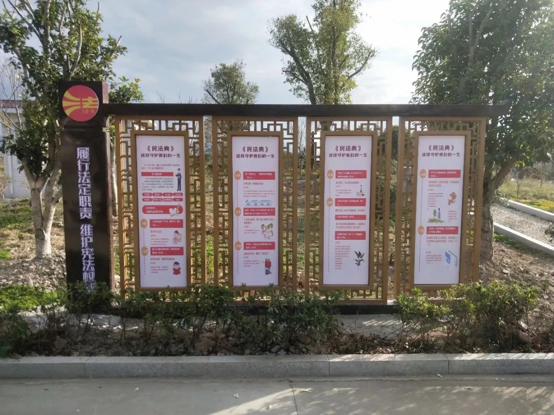 2020年9月,经过为期两个月的精心准备和施工,龙山镇首个以民法典为主题的法治公园正式上线啦。该公园位于龙山镇杨高村高巷老年室旁,建有的民法典壁、宪法亭、故事栏,有与群众生活息息相关的八块民法典海报,将法治元素与原有景观有机融合,让群众在休闲中了解民法典、学习法律知识、感受尚法氛围,将法治理念深植于心。其余5个民法典阵地速览