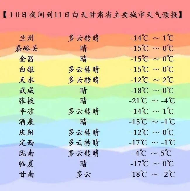 11日白天,全省各地多云转晴,祁连山区阴有小雪。另外,河西五市有5-6级西北风,阵风7-8级,局部地方有沙尘;平凉、庆阳两市有5级左右西北风,阵风6-7级。