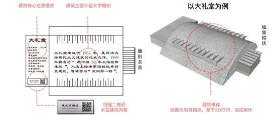 核心信息阅读:以石材刻字的形式,在砌块表面呈现建筑的核心信息,使观览者可以第一时间了解建筑的主要信息,形成直观的阅读体验。