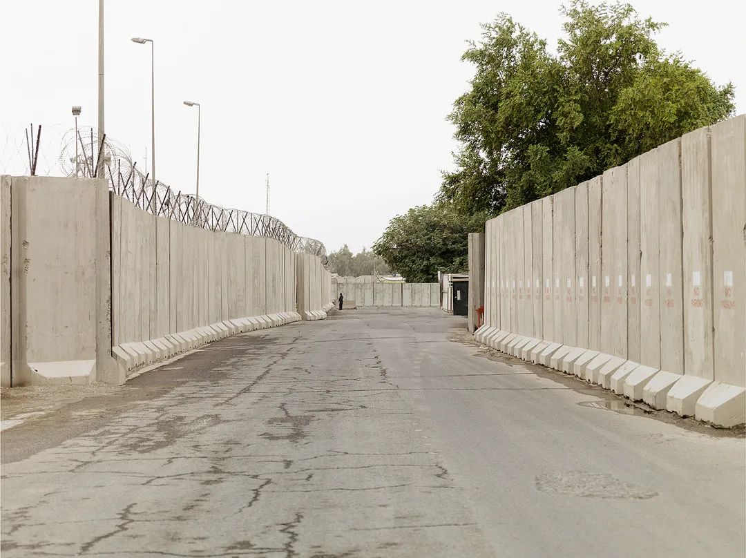 伊拉克和阿富汗的冲突已经成为我们所有人历史的一部分,怀利认为他在这些战争区域的拍摄是他在北爱尔兰拍摄工作的自然延伸。这张照片来源于还未发表的位于巴格达的“绿色地带”(现在是国际区域)系列,这个位于城市中心的大面积区域已成为戒备森严的“安全区”,汇聚了军队和文职人员(主要是美国的),以及伊拉克政府雇员。为保证这个区域的安全,几乎什么东西都被高高的混凝土抗爆墙所围住,几乎所有东西都不能改变,包括道路。其结果就是一个迷宫,如怀利所说,住在这个区域的心理感受就像一只实验室迷宫里的老鼠。