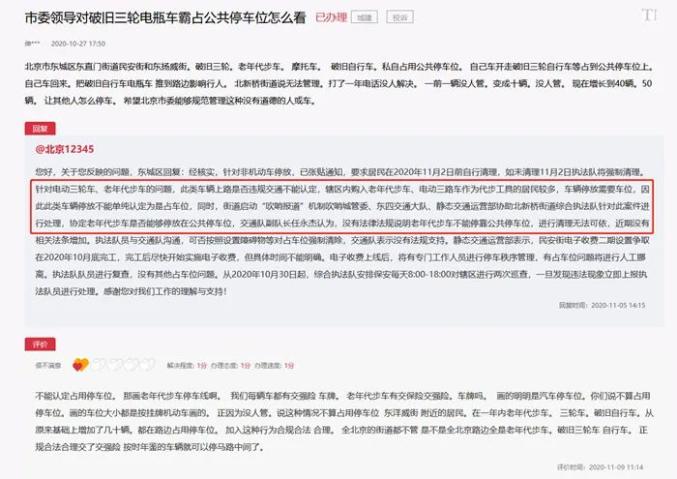 一名北京网友在人民网留言反映“老年代步车”私自占用公共停车位的问题,@北京12345回复称:针对电动三轮车、老年代步车的问题,此类车辆上路是否违规交通不能认定,辖区内购入老年代步车、电动三轮车作为代步工具的居民较多,车辆停放需要车位,因此此类车辆停放不能单纯认定为是占车位。