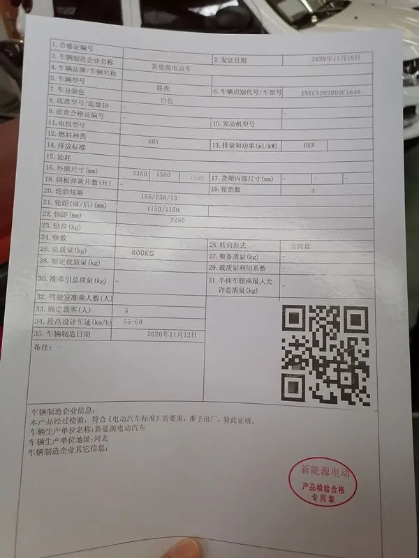 企业提供的车辆合格证。人民网 金慧慧摄上述财务人员出示了一份合格证,车辆型号为“路虎”,最高设计车速为55至60公里/小时,左下角写着:本产品经过检验,符合《电动汽车标准》的要求,准予出厂,特此证明。