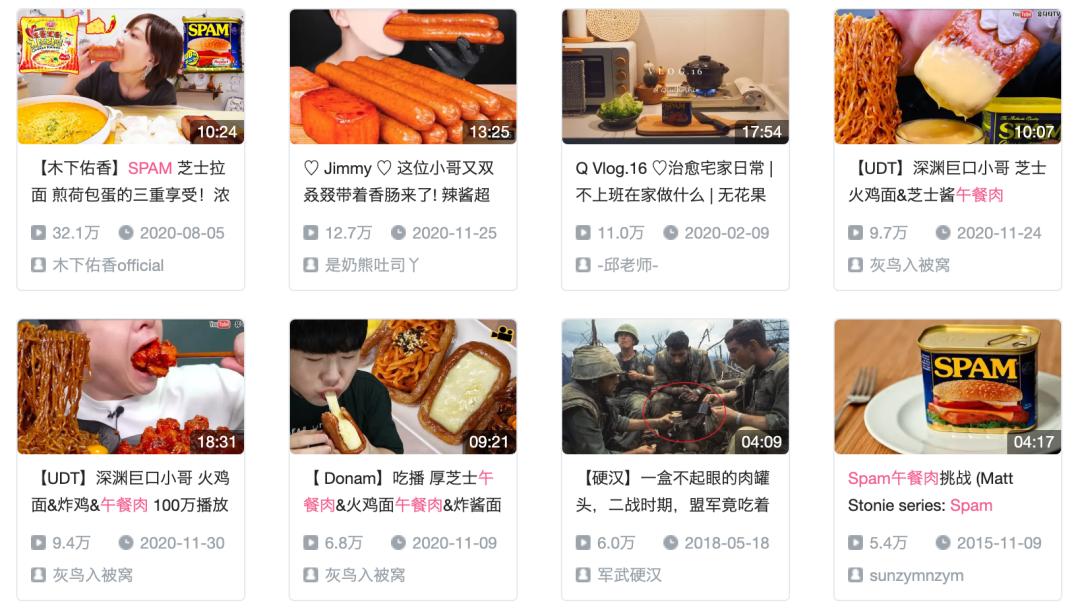 B站、抖音和快手上,常年也有美食博主发布SPAM的试吃视频。