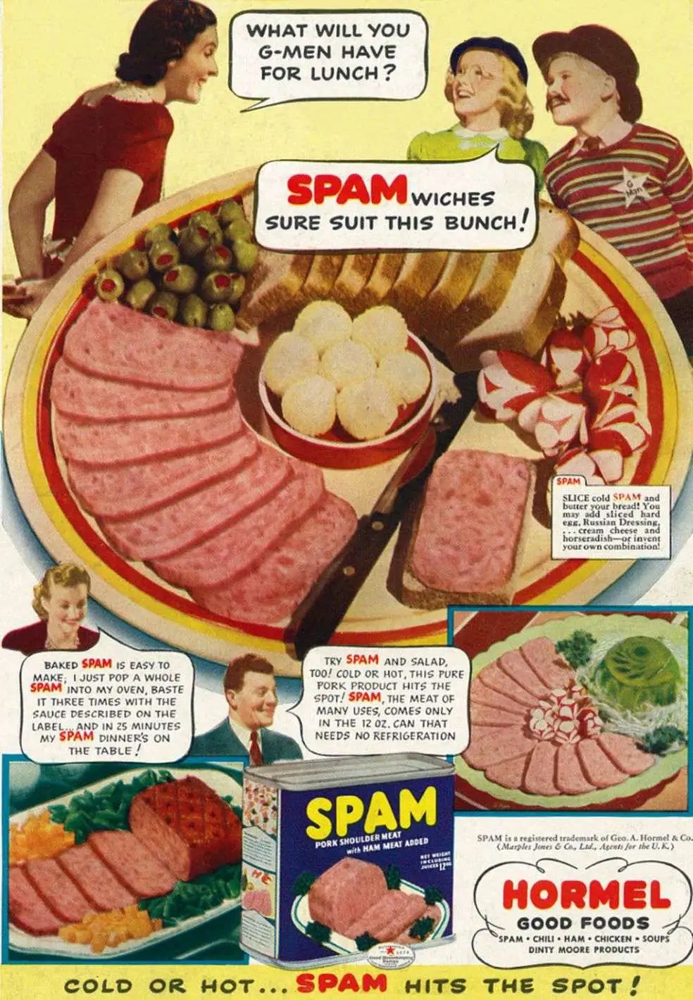 不知道是不是内定,荷美尔肉联厂一位副总裁的哥哥给它起名为SPAM(Shoulder of Pork and Ham “猪肩肉与火腿”的首字母大写),事儿就这么定了。