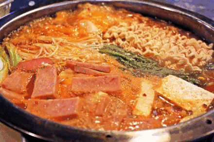 △ (纪念关岛解放60周年版本的SPAM罐头)又如韩国的部队锅,午餐肉算是锅里的重头戏,其前身也叫作“联合国汤”,来源于哪场战争大家心知肚明,你再品品这个名字。