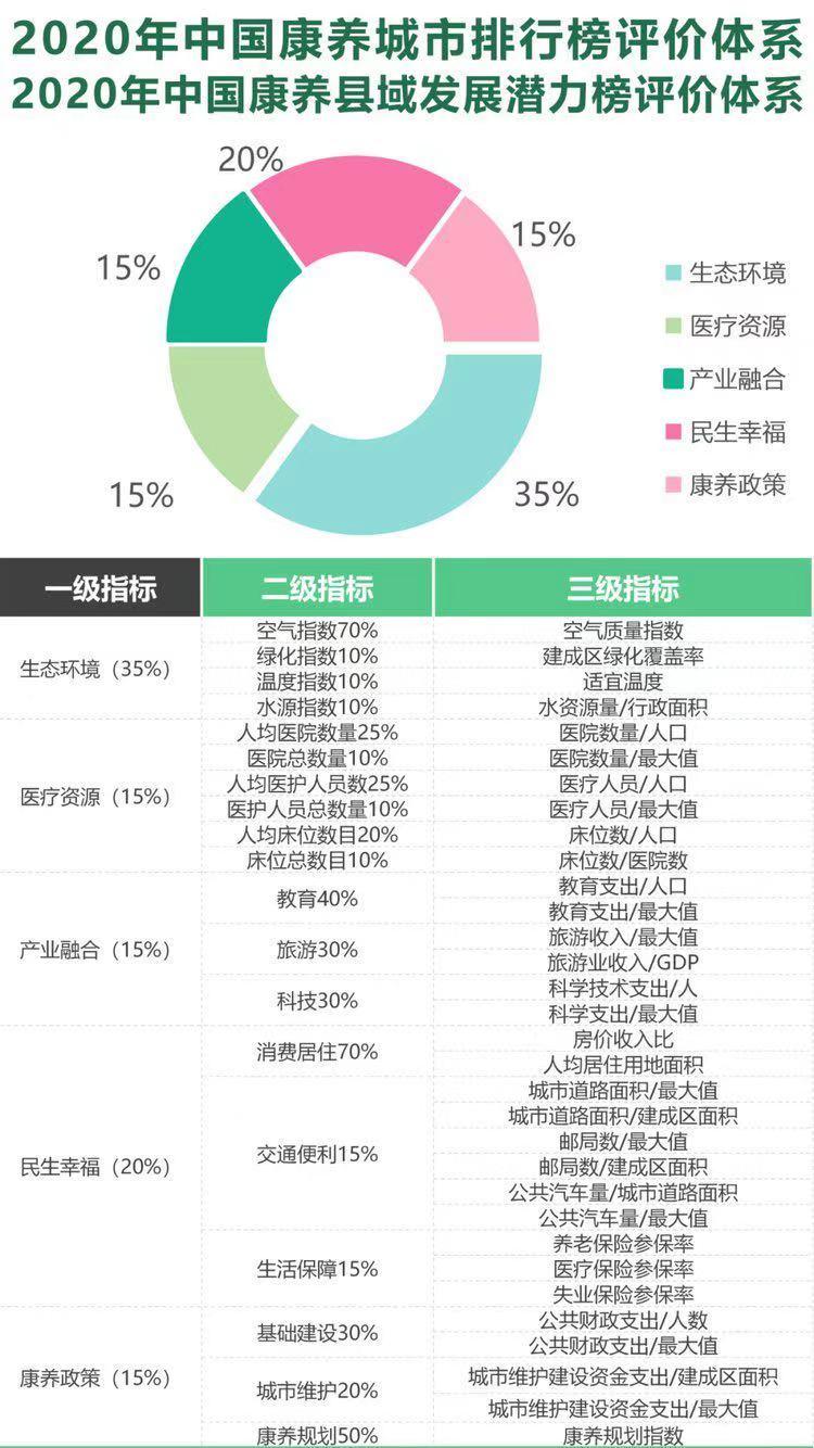 康养城市是指以“健康”为城市开发的出发点和归宿点,以健康产业为核心,将健康、养生、养老、休闲、旅游等多元化功能融为一体,形成的生态环境较好的特色城市。其评价体系如下图: