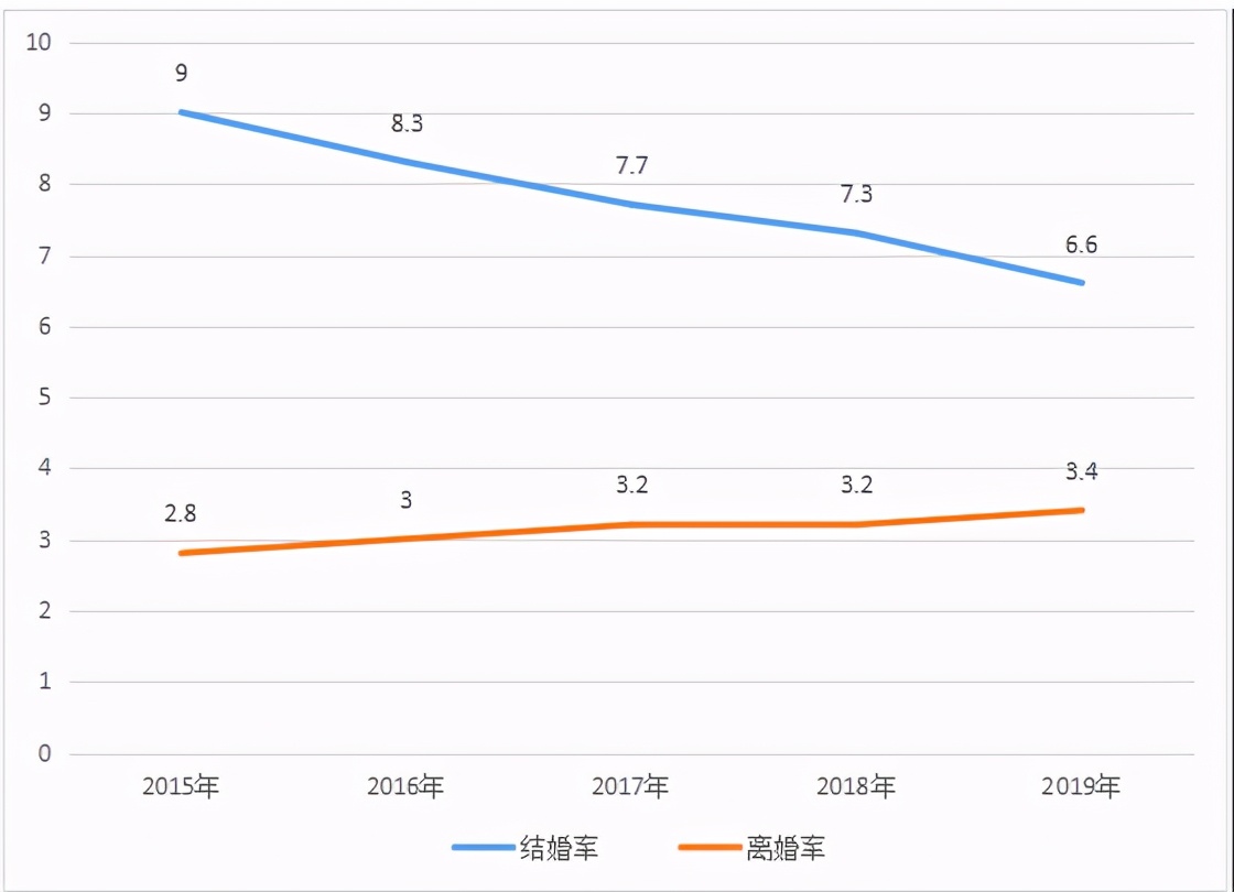 根据民政部数据显示,2019年,全年依法办理离婚手续470.1万对,比上年增长5.4%,其中,民政部门登记离婚404.7万对,法院判决、调解离婚65.3万对,离婚率为3.4‰,比上年增长0.2个千分点。