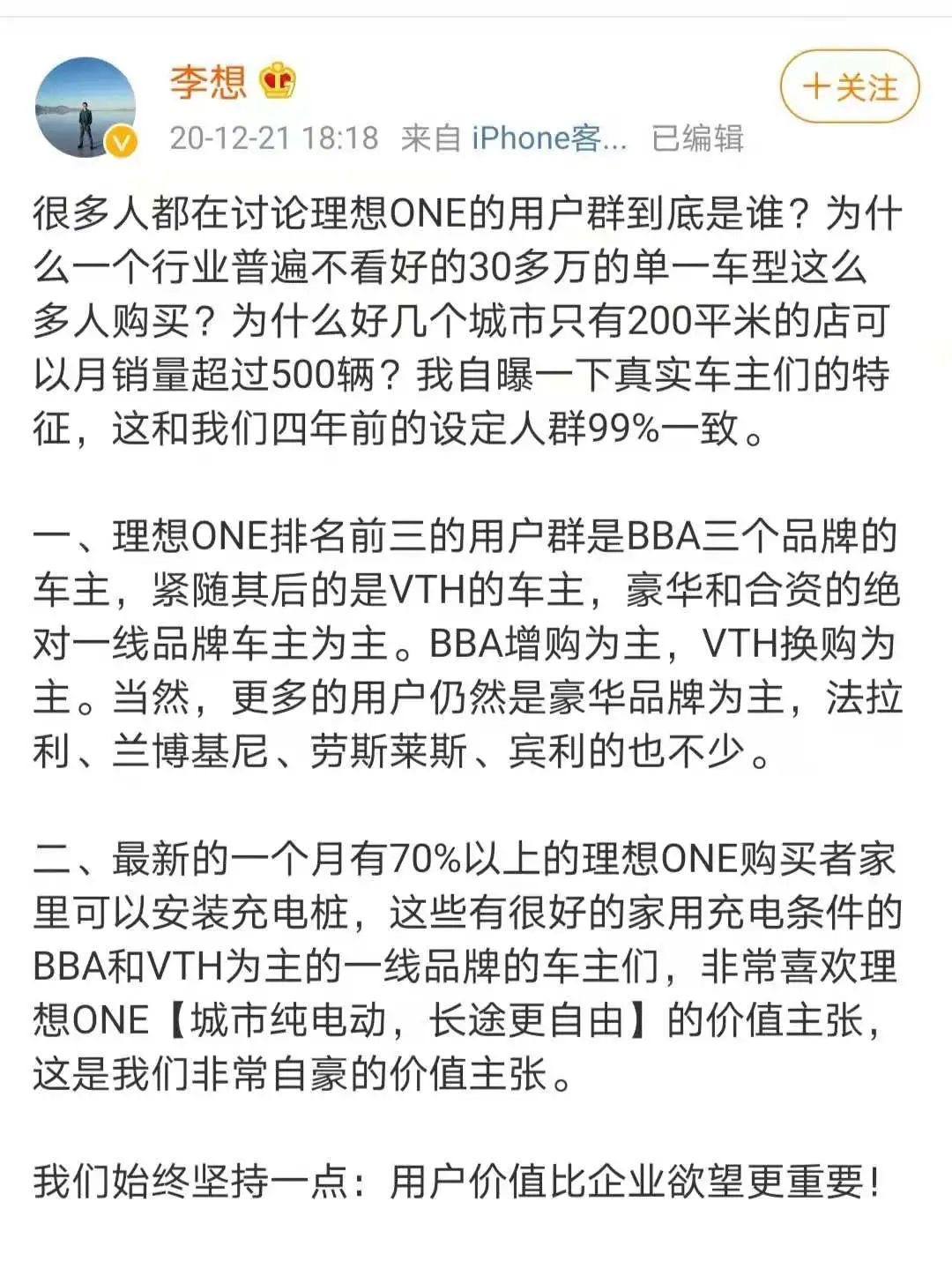 目前理想用户车主的真实特征,跟四年前创业时的设定人群99%一致,存在高度重叠,这也侧面证实了创始人李想的判断力。“理想ONE如果只有宝马X5一半的价格,大家想不想买?”这个话有点夸张,但产品的差异化确实立得住了。