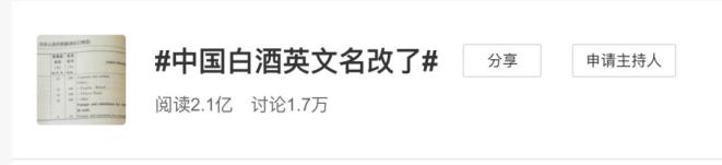 1月14日上午,中国白酒改英文名的事情引来网友热议,#中国白酒英文名改了#的话题一度冲上热搜,每经小编注意到,目前该话题的阅读量为2.1亿,讨论量为1.7万。