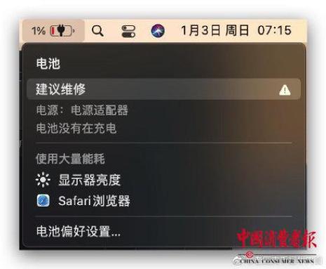 消费者何女士对记者说,她是于2019年在苹果官网购买了2017款MacBook pro,之前电脑的运行一直非常正常,但就是今年1月8日下午,当她准备用电脑时,发现电脑无法开机,插上电源后,电脑才顺利开机。开机后却发现电池只有1%的电量,而且显示“电池需要维修 电池没有充电” 。