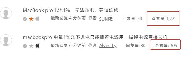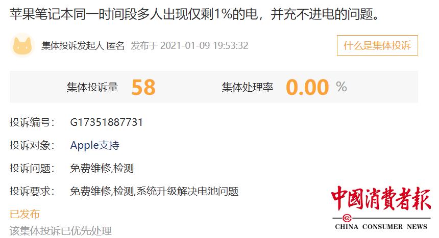 苹果笔记本电脑MacBook Pro电池容量显示1%,且不能充电的情况,在黑猫投诉等网络平台上均有不少投诉。