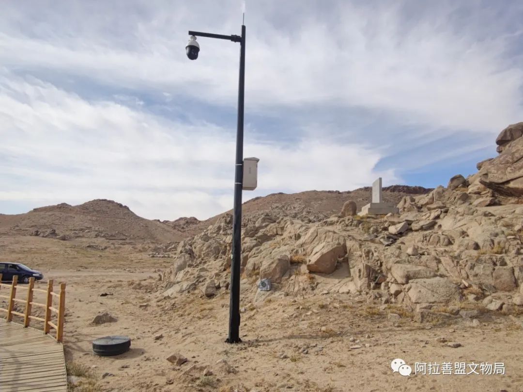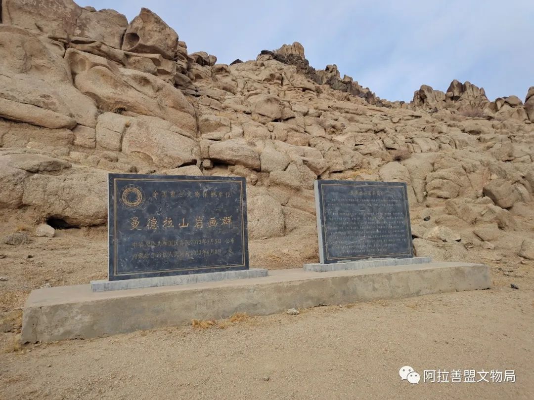 近年来,阿拉善盟委、行署高度重视岩画保护工作。全盟深入贯彻落实习近平总书记关于文物工作重要论述和重要指示批示精神,先后制定印发了《阿拉善岩画保护管理办法》、《阿拉善右旗岩画石刻保护管理暂行办法》,为岩画保护工作提供了有力的制度保障,岩画“四有”工作扎实开展,明确了每处岩画的保护机构。建立岩画调查资料档案,对曼德拉山、贺兰山西麓部分岩画开展数字扫描工作,着手构建阿拉善岩画数据库,补充完善岩画“四有”档案,确定并公布了岩画保护和建设控制地带范围。在集中的岩画分布区域树立了40多个保护标志,在人员活动频繁的区域设置了保护警示牌。特别是曼德拉山岩画树立了文物保护单位标志2块、保护区域界标碑350块。盟、旗文物保护机构不断加强巡护检查力度,驼峰(长城)文物义务保护队也将岩画保护纳入巡查职责。在曼德拉山岩画、巴彦浩特岩画、水磨沟岩画等遗址区域,架设野外文物监控微波传输系统和户外广播系统,探索用科技手段提升岩画保护工作的效能。