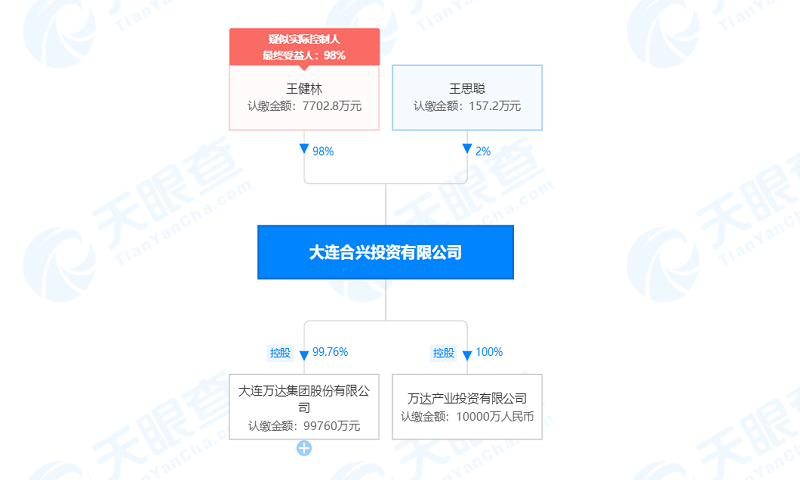 大连合兴的实控人为王健林,持股比例98%,王思聪作为二股东,持股2%。其持股的公司仅有两家,除了万达产业投资外,还有大连万达集团股份有限公司(下称“万达集团”)。