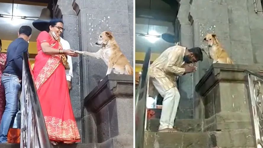 印度一流浪狗在寺庙外与信徒挨个握手