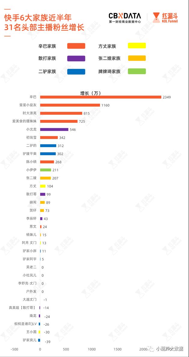 CBNData消费站曾在六大家族中挑选了5-6位代表,将其2020年6月4日-11月16日粉丝增长数量进行排序,其中只有散打家族旗下的小沈龙,新增粉丝数超过500万,5大家族除头部核心主播之外,部分成员粉丝增长缓慢甚至停滞,二驴家族的桐桐、爽儿,散打家族的南龙等人进入粉丝负增长阶段。