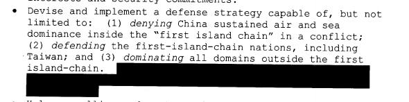 而第二点则语调最高,文件要求美国军队在战时足以“保卫”(Defend)第一岛链内的盟国与伙伴,当然也包括台湾地区。此外文件还要求美国军队必须在第一岛链外的所有领域维持“支配”地位。这份文件随后还有一个部分内容被涂黑,没有被解密,这可能涉及到美军对华核政策或者美军针对中国本土,乃至针对人民政权的战略框架。