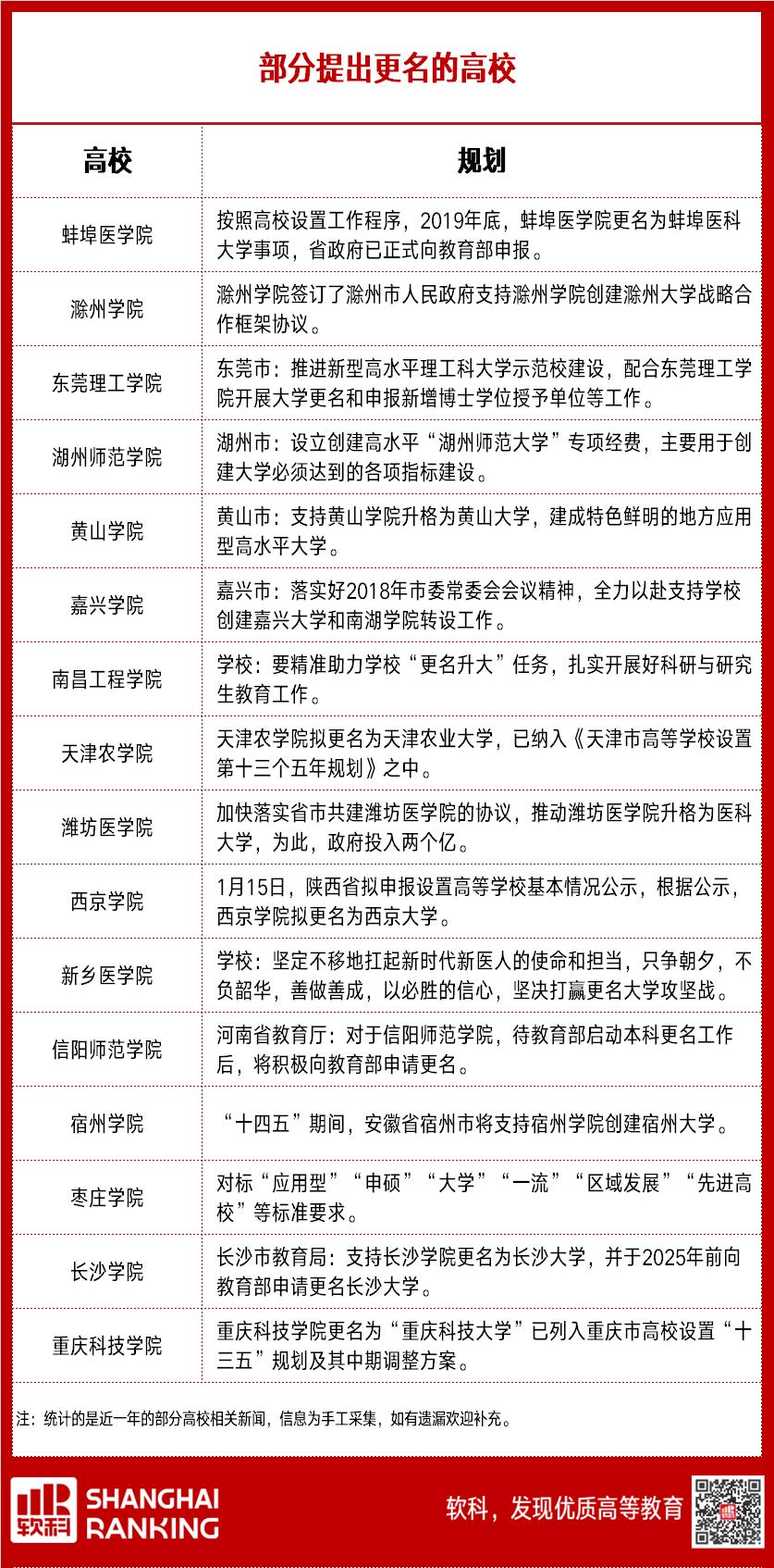 软科(ID:zuihaodaxue)手工搜集并整理摘录了各地学院争取更名为大学的信息。内容为不完全统计且排名不分先后,不代表软科观点,仅供参考,请以官方文件为准。