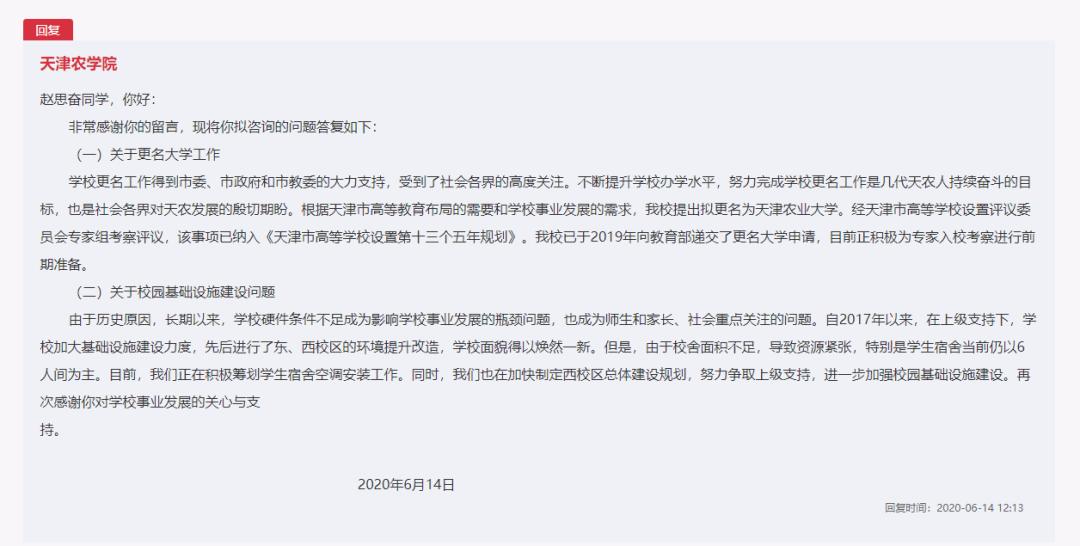 对更名事件,在2020年6月14日天津回复称:天津农学院更名为大学此事已经得到各界的支持,天津农学院拟更名为天津农业大学,已纳入《天津市高等学校设置第十三个五年规划》之中。早在2019年天津农学院已经递交了更名大学的申请,目前为考察前期。潍坊医学院