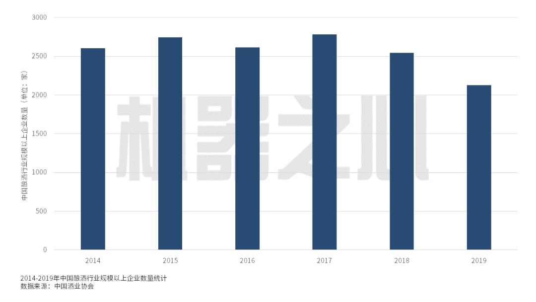 2014-2019年,全国成规模酿酒行业企业数量较为稳定,达到2500家以上。截止2019年12月,全国规模以上酿酒行业企业数量为2129家。从酿酒行业销售收入来看,白酒行业销售收入在酿酒行业销售中占据主要比例,规模以上白酒行业企业销售收入占比67%;其次啤酒行业销售收入占比20%,黄酒与葡萄酒占比较低,仅为2%。