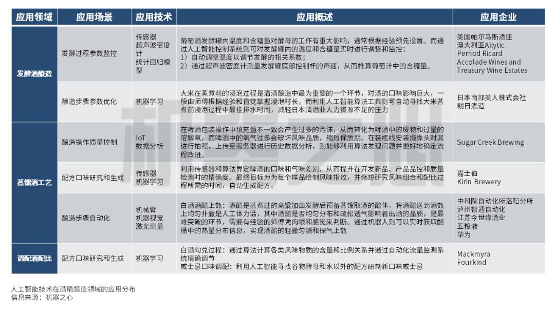 酿造酒的品质的主要影响因素包括原料、发酵过程的参数控制,很大程度上受气候、地域和经验影响,机械化程度低且难,在工业化和自动化未全面覆盖的情况下,人工智能不容易发挥作用。以我国白酒为例,工艺流程精细,受产地和工艺操作影响极大,市场对人工智能的参与是否对酒的口味有保留和提升还持保留态度。
