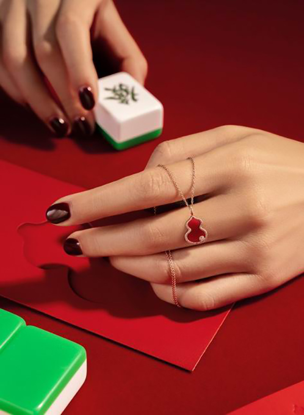 Qeelin与包先生于设计伊始便达成共识,希望以创新的方式呈现本次珠宝作品,加入一款可调节长度的红绳巧思相应而生。红绳在传统文化中与葫芦一样象征福运,此次是Qeelin首次将红绳融合在珠宝设计中,并将红绳和葫芦两种传统元素以现代摩登设计联结。 除了18K玫瑰金项链的搭配,红绳可缠绕腕间,双重佩戴方式为时尚造型增添趣味与个性,演绎无限可能。