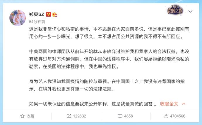 1月19日,郑爽发微博回应“代孕风波”,称“这是我非常伤心和私密的事情。在中国国土之上我没有违背国家的指示,在境外我也更是尊重一切的法律法规。”还称屡遭曝光隐私的勒索。①