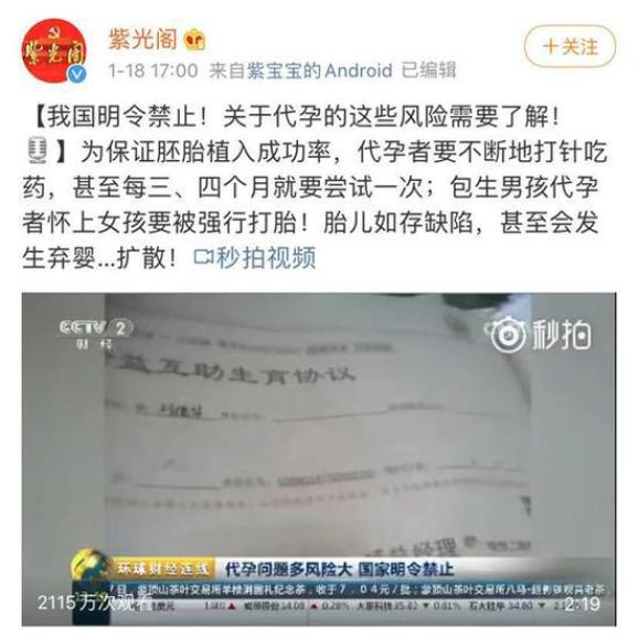 这次女演员郑爽被曝出“代孕生子”后,1月18日“@紫光阁”、“@共青团中央”等官方微博共同发文:“我国明令禁止!关于代孕的这些风险需要了解!”