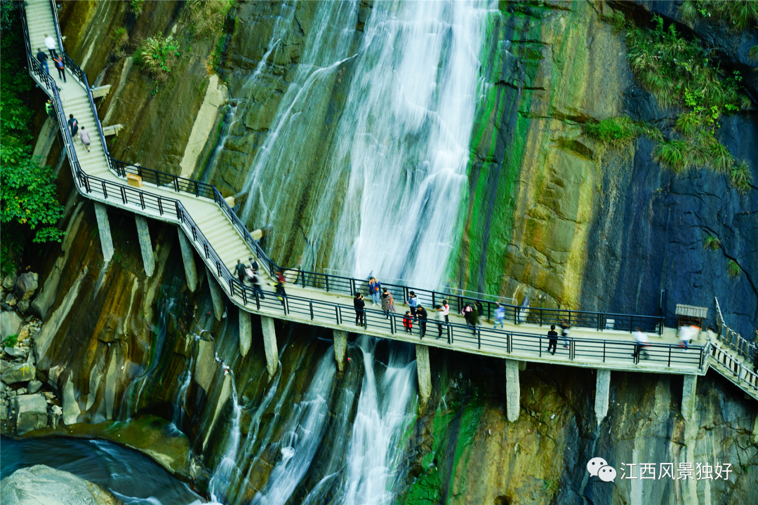 在峡谷两旁的崖壁上,两条风格各异高空栈道蜿蜒前行、遥遥相望。白鹤崖这边的栈道,部分采用玻璃铺设,脚下陡峭峡谷与急流溪水一览无遗,胆小游客在此可能尖叫不断、寸步难行。对面的栈道,则别有一番情趣,整个栈道犹如一条玉带忽隐忽现地穿过大片森林与一群瀑布。这些瀑布有的离栈道较远,只能举目眺望;而有的就在栈道脚边,伸手就可触及。这些瀑布的水流、形状也是各不相同,有的水流小又慢,自上而下缓缓地平铺在整块大石壁,碰起层层叠叠小水波浪就像一朵朵长在岩山上的花朵,人们称之岩花瀑;有的则大又急,直接从悬崖峭壁上以“飞流直下三千尺,疑是银河落九天”气势迎头冲下,大量水花在崎岖不平的崖壁上四处跳跃、到处溅落,最后全部落入河道中。整个空中弥漫着微白色的水雾,在阳光照射下,形成一座美丽的七彩虹,故名彩虹瀑。从栈道往下看,谷中有三个似圆形大锅的深水潭,人称“三口锅”。传说女娲补天的五彩石就在这下面,也有人说“三口锅”底下是暗河,可以直通鄱阳湖。