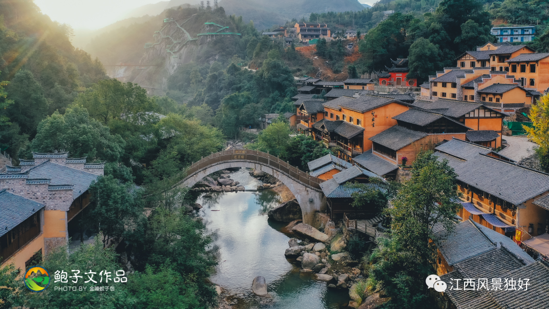 说到河与水,自然也就离不开桥。在景区入口处,有一座红色单拱钢结构大桥,拱桥坡度较小,游客走在上面如同“平步青云”,其桥名也正是“青云桥”。穿过青云桥,来到一座风雨廊桥,廊桥采用的是抬梁式架构,整个结构和工艺富有江西地方特色。峡谷中段,有一座高空钢架桥横跨峡谷上空,中间悬有“望仙谷”三个大字,桥虽显简单但似乎又带点粗犷美。在众桥中,若说谁最美,揽月桥当仁不让。它是一座石拱桥,取材于当地的花岗岩,由百层方石堆砌而成,远看就像一轮弯弯的新月。圆月夜里,圆圆的拱桥可将溪谷中的月亮倒影一揽而入,这也是为何取名“揽月桥”的缘故。