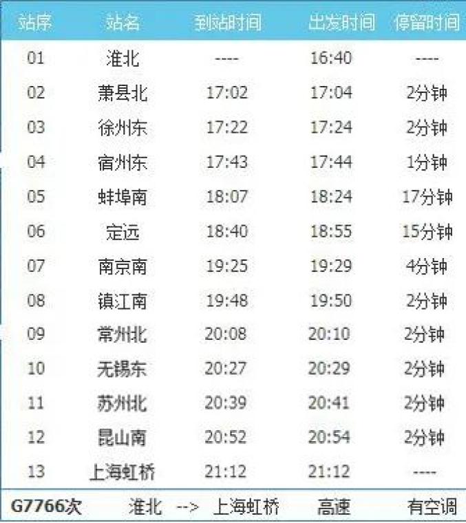 淮北—合肥G7778/5次淮北13:40发,合肥15:51到,途经淮北北、萧县北、徐州东、蚌埠南。